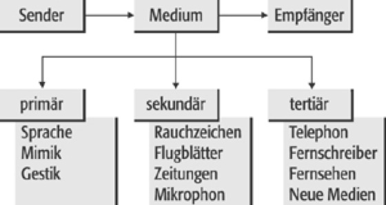 Medien, E medium, im Allgemeinen die Mittel zur Kommunikation von Information. In den Informations- und Kommunikationswissenschaften existieren allerdings unterschiedliche Bedeutungsdimensionen des Begriffs, die Medien u. a. als technologische Gegenstände, als Nachrichten verbreitende Institutionen oder als Anwendung von Symbolsystemen definieren. Eine Unterscheidung nach dem Grad der Technisierung des Kommunikationsmittels erfolgt durch die Einteilung primärer, sekundärer und tertiärer Medien (Abb. 1) wobei im engeren Sinn nur die als sekundär und tertiär aufgeführten Medien technische Gegenstände darstellen. In der Mediensemiotik werden Medien nach dem verwendeten Kode eines Mediums differenziert, woraus eine vielschichtige Struktur von Medien resultiert (Abb. 2). Diese unterscheidet auf einer obersten Ebene nach dem Wahrnehmungs-, bzw. Sinneskanal in visuelle, auditive, taktile usw. Medien. Die für die Kartographie wichtige Kategorie der visuellen Medien wird in Text- und Bildmedien, letztere weiter in Abbilder und logische Bilder gegliedert. Gegenüber Abbildern als ikonische und ikonographische Repräsentationen von Objekten (vgl. Ikonizität) sind logische Bilder Repräsentationen im Sinne von Diagrammen, Netzen oder Karten, welche die Abbildungsfläche eines Mediums wenigstens teilweise zur Repräsentation von logischen Beziehungen zwischen Objekten nutzen. Neben der Differenzierung nach diesen Eigenschaften werden Medien im Sinne von Multimedia häufig wie folgt unterschieden: Video (Film), Animation, Audio (Ton), Text, Bild und Graphik. Ein Video ist eine in der Realität aufgenommene Sequenz von Einzelbildern. Videos zeigen daher reale Objekte mit ihren individuellen Ausprägungen. Eine Animation ist eine am Computer oder Zeichentisch konstruierte Sequenz von Einzelbildern. Animationen können somit auch Objekte und Phänomene zeigen, die nicht real sichtbar sind. Audio (Ton) sind akustische Signale, die entweder als Einzelton oder als Tonfolge vorkommen. Audio kann ein natürlicher Ton (z. B. in Form von Umweltgeräuschen) oder ein abstrakter Ton (z. B. zur akustische Visualisierung von Daten) sein. Text ist eine Ansammlung von alphanumerischen Zeichen, die in Form von Fließtext, Tabellen oder Einzelangaben auftreten. Bilder sind in der Realität aufgenommene Darstellungen von Objekten oder Objektgruppen. Sie lassen sich entsprechend ihres Aufnahmespektrums z. B. in Photo, Radarbild oder Infrarotbild gliedern. Graphiken sind konstruierte Darstellungen von gedanklich überarbeiteten Modellen von Objekten oder Sachverhalten. Zu den Graphiken zählen Schemazeichnungen, Diagramme und Karten.
