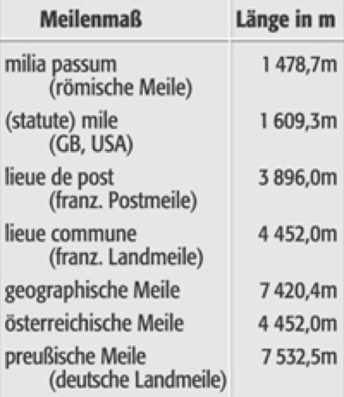 Meile (Tab.):Meile (Tab.): Unterschiedliche Meilenmaße.