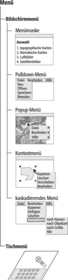 Menüs gelten als leicht erlernbare Interaktionsform, obwohl sie viel Bildschirmplatz benötigen und eine Auswahl i. d. R. langsamer als bei anderen Interaktionsformen erfolgt. Menüs können syntaktische Eingabefehler von Kommandos vermeiden helfen, sind aber für die Eingabe von Parametern, z. B. als Farbmenü, schlecht geeignet. In vielen Programmen und vor allem auch in Geoinformationssystemen und anderer kartographischer Software können Menüs durch den Nutzer konfiguriert werden, sodass eine nutzerspezifische Zusammenstellung von Kommandos bspw. bei der Digitalisierung oder Editierung von Karten möglich ist (Adaptierbarkeit). Durch den Einsatz von Digitalisiertabletts in diesem Bereich werden vielfach neben Bildschirmmenüs Tischmenüs verwendet, die auf den Tabletts eingerichtet werden können.