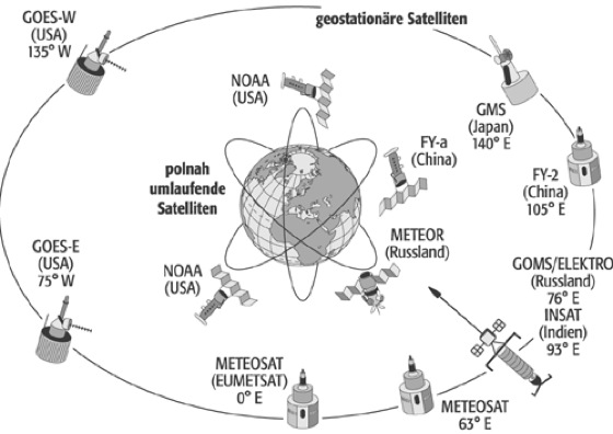 meteorologisches Satellitensystem, wird von der Weltorganisation für Meteorologie koordiniert und ist als Bestandteil des globalen Beobachtungssystems (Abb.) ein Beitrag zur Welt-Wetter-Wacht. Es besteht aus zwei Teilsystemen, nämlich fünf geostationären und mindestens zwei polarumlaufenden Wettersatelliten. Das System ist derart abgestimmt, dass eine kontinuierliche und global lückenlose Erdbeobachtung gewährleistet ist. Die geostationären Satelliten erfassen nahezu kontinuierlich das Gebiet der Erde zwischen ca. 70° Nord und Süd, jedoch nicht die Polargebiete. Jeder sonnensynchrone, polarumlaufende Satellit erfasst dagegen zweimal pro Tag die gesamte Erde in einzelnen, zeitlich versetzten Beobachtungsstreifen, die im Falle der National Oceanic and Aeronautical Agency-Satelliten eine Breite von ca. 3 000 km haben. Die operationellen geostationären Satelliten sind: Meteosat, GOES, GMS sowie GOMS; die polarumlaufenden Satelliten sind stets zwei Satelliten der National Oceanic and Aeronautical Agency sowie METEOR.