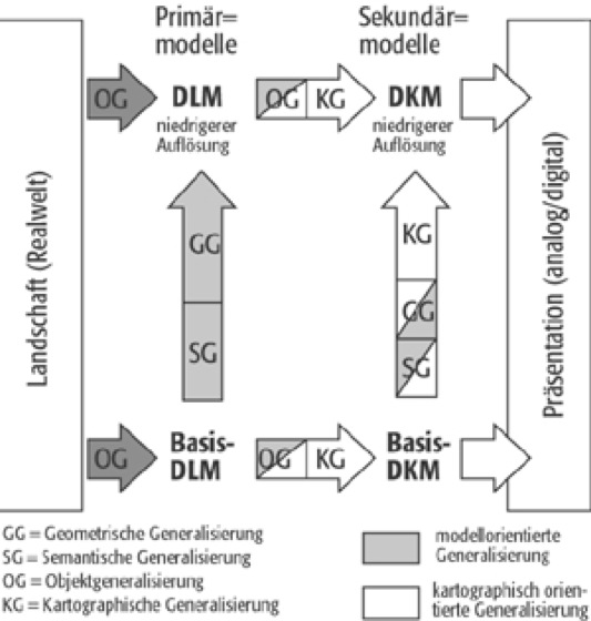 Hierbei sind zuerst semantische und im Anschluss daran geometrische Teilvorgänge zu realisieren (vgl. semantische Generalisierung, geometrische Generalisierung). Entsprechend der jeweiligen Zielstellung sind zum einen nach dem klassischen Prinzip Ausgangskarte-Folgekarte digitale Landschaftsmodelle für kleinere Maßstäbe abzuleiten, die nach Bedarf in ein entsprechendes ATKIS-DKM als Sekundärmodell überführt werden können.