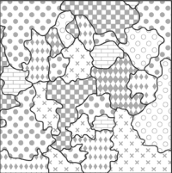 Mosaikkarte, E mosaic map, abgeleitet aus der kartographischen Objekt-Zeichen-Referenzierung ein Kartentyp zur Repräsentation von nominalskalierten Daten mit Bezug zu zweidimensional definierten natürlichen Arealen (Abb.). Die Repräsentation der Daten in der Mosaikkarte erfolgt auf der Grundlage des kartographischen Zeichenmodells durch flächenförmige Zeichen, die mithilfe der Graphischen Variablen Form, Farbe oder Richtung variiert werden können. Der Begriff der Mosaikkarte basiert auf der Assoziation der Flächennutzungsstruktur als mosaikförmig aus kleinen Teilen zusammengesetzter räumlicher Einheit. Typische Beispiele für Mosaikkarten sind die Flächennutzungskarte, der Flächennutzungsplan und die Bodenkarte (vgl. Flächenmethode).