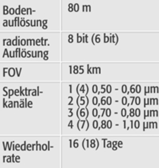 MSS, Multispektral Scanner, optomechanischer Scanner auf Landsat 1-5 (Tab.). MSS zeichnet in vier Spektralkanälen im sichtbaren und nahen Infraroten Bereich des elektromagnetischen Spektrums auf. Wichtiges Anwendungsgebiet ist die Dokumentation und Analyse der Dynamik von Landnutzung und Landbedeckung über größere Zeiträume hinweg (multitemporal change detection). MSS-Daten liegen seit dem Beginn der operationellen Phase von Landsat-1 im Jahre 1972 vor.