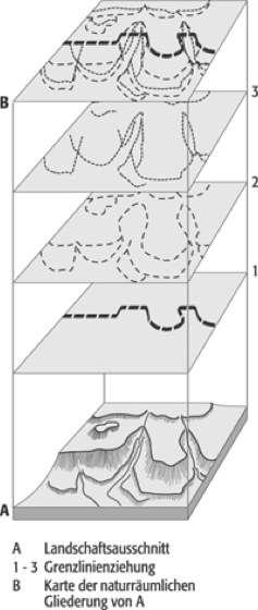 naturräumliche Gliederung, Verfahren zur Ausscheidung von räumlichen Landschaftseinheiten, die als Typen dargestellt werden und sich nach der Theorie der geographischen Dimensionen hierarchisch ordnen lassen. Die naturräumliche Gliederung als traditionelle Methodik der Landschaftsökologie orientiert sich an naturräumlichen Grundeinheiten, die überwiegend nach den visuell wahrnehmbaren Kriterien ausgewählter Einzelmerkmale von Ökofaktoren begründet werden, wie z. B. Hangneigung, Oberflächenformen und Natürlichkeitsgrad der Vegetation (Abb.). Es handelt sich demnach um einen physiognomischen Ansatz, der davon ausgeht, dass bestimmte Geoökofaktorenmerkmale das landschaftshaushaltliche Geschehen als Indikatoren ausdrücken und daher keine aufwendige quantitative Untersuchung vorgenommen werden muss. Die naturräumliche Gliederung wird in Kartenwerken dargestellt. Bekanntes Beispiel ist die "Karte der naturräumlichen Gliederung Deutschlands" 1 : 200 000. Bis heute ist eine Vielzahl methodischer Beiträge zur Ausscheidung der naturräumlichen Einheiten erschienen.