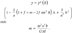 Normalschwere, Betrag des Schwerevektors in einem Punkt des Normalschwerefeldes mit der ellipsoidischen Breite B und der ellipsoidischen Höheh (Normalschwerevektor). Zur Berechnung der Normalschwere in einer ellipsoidischen Höhe h kann folgende Näherungsformel herangezogen werden: