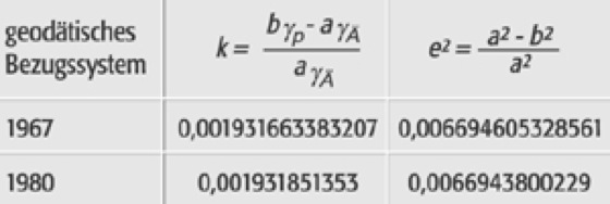 Basierend auf den Fundamentalparametern der betreffenden geodätischen Referenzsysteme ergeben sich die in der Tabelle (Tab.) zusammengestellten Zahlenwerte für die Größen k und e2.