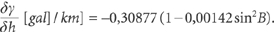 Normalschweregradient, Differentialquotient, der die Änderung der Normalschwere mit der ellipsoidischen Höhe angibt. In Abhängigkeit vom gewählten Geodätischen Referenzsystem sind die entsprechenden Ellipsoidparameter und die Normalschwere γ0 (B) eines Ellipsoidpunktes der ellipsoidischen Breite B0, berechnet nach der Normalschwereformel einzusetzen: