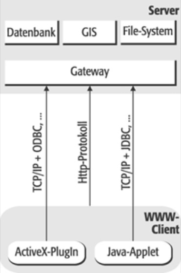 Online GIS, Verwendung der Dienste des Internet als Benutzerschnittstelle zu einem Geoinformationssystem. Vor allem das World Wide Web (WWW) wird aufgrund seiner Kommunikations- und Präsentationsmöglichkeiten als ein solcher Dienst für öffentlich zugängliche raumbezogene Informationssysteme genutzt. Der Browser wird dabei als Map-Client genutzt um bspw. über Formulare Anfragen an den Datenbestand zu formulieren während ein Server als Map-Server eingesetzt wird, um die Anfragen kartographisch, etwa in Form von maps-on-the-fly umzusetzen. Technische Anbindungsmöglichkeiten bestehen in der Kombination von Client-Programme als Webbrowser, Java-Applets oder ActiveX-Plugins mit unterschiedlichen Übertragungsprotokollen und Gateways (z. B. das Common Gateway Interface) auf dem Server (vgl. Abb.). Anwendungsmöglichkeiten von Online-GIS bestehen u. a. im Angebot von Zugängen zu zentralen digitalen Kartenarchiven und Geodatenbanken oder im Rahmen der Routenplanung.