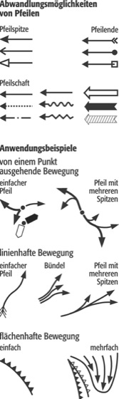 Pfeil, als graphische Gestalt in der Kartographie das universelle Darstellungsmittel der Vektorenmethode. Die Pfeilgestalt ist in vielfältiger Weise im Sinne der graphischen Variablen abwandelbar, und zwar nach der Länge, der Breite, der Farbe, der Füllung (Muster), der Form der Spitze und der Form des Pfeilendes (Abb.). Außerdem kann der Pfeil als Pfeilkette für lineare Verläufe (Linienrichtungskarte) und als Pfeilschar für flächige Aussagen (Flächenrichtungskarte) benutzt werden.