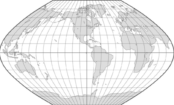 Planisphäre, E planisphere, Bezeichnung für eine Gesamtdarstellung der Erde in einer geschlossenen Fläche, die häufig eine ellipsenförmige oder ellipsenähnliche Begrenzungslinie besitzt. Beispiele hierfür sind unechte Zylinderentwürfe, wie Mollweides unechter Zylinderentwurf, Eckerts unechter Zylinderentwurf (Abb.), Mercator-Sansons sinusoidaler Entwurf, Kawraiskis unecht zylindrischer Entwurf und Kawraiskis winkeltreuer Entwurf. Man könnte auch Bonnes unechten Kegelentwurf zu dieser Gruppe zählen. Die Verzerrungen in den Randgebieten der Planisphären sind zum Teil beträchtlich. Daher sind in den letzten Jahrzehnten Entwürfe für Planisphären angegeben worden, die auf eine geschlossene Umrisslinie verzichten. Die geringeren Verzerrungen werden hier durch den Verzicht auf die geschlossene Begrenzungslinie erkauft.