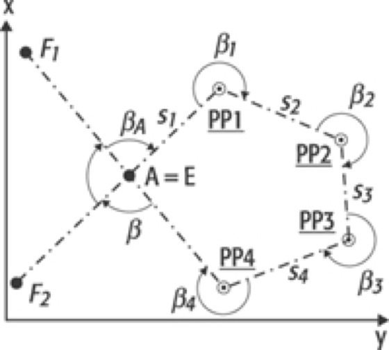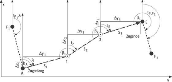 müssen entweder bekannt sein oder werden aus den Koordinaten der AnschlusspunkteA und E sowie aus den Koordinaten der Fernpunkte F1 und F2 berechnet. Die Strecken der Polygonseiten S1 bis SE können mithilfe der mechanischen, optischen oder elektrooptischen Distanzmessung bestimmt werden. Auf den PP misst man mit einem Theodoliten oder einem elektrooptischen Tachymeter die Richtungen und berechnet die in Zugrichtung linksliegenden Brechungswinkel β. Mithilfe der o. gen. vorhandenen und gemessenen Größen werden die Koordinaten der Polygonpunkte berechnet. Beim Ringpolygon entspricht der Anfangspunkt dem Endpunkt (A =E). Die Polygonpunkte werden dauerhaft vermarkt und eine Einmessung vorgenommen.