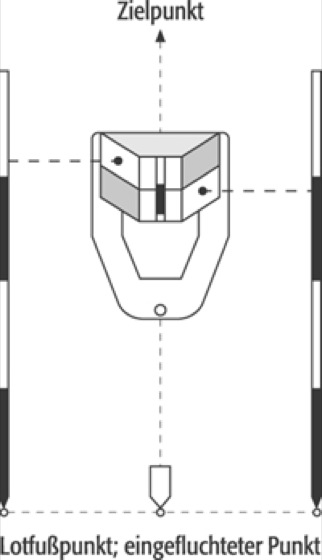 Prisma, E prism, lichtdurchlässiger und lichtbrechender Polyederkörper aus Glas oder Kunststoff. Prismen werden in Vermessungsinstrumente eingebaut, als Winkelprismen oder als Reflektoren verwendet. Je nach Prismenform unterscheidet man bei den Winkelprismen Drei-, Vier- und Fünfseitprismen (Pentagonprismen). Durch entsprechend geschliffene und/oder verspiegelte Prismenflächen erreicht man aufgrund der Brechungs- und Reflexionsgesetze, dass z. B. der einfallende zum austretenden Lichtstrahl um einen rechten Winkel abgelenkt wird. Prismen zur Erzeugung rechter Winkel werden u. a. bei der Orthogonalaufnahme und bei Absteckungen nach rechten Winkeln benötigt. Werden zwei Pentagonprismen übereinander angeordnet, so spricht man von einem Doppelpentagon(Abb. 1). Hierbei wird der links in das eine Prisma und rechts in das andere Prisma einfallende Lichtstrahl rechtwinklig abgelenkt und beide Scheitelpunkte der rechten Winkel liegen übereinander. Ist eine Messungslinie(Abb. 2) mit zwei Fluchtstäben signalisiert, so befindet man sich mit dem Doppelpentagon dann in der Messungslinie, wenn die Bilder der Fluchtstäbe in beiden Prismen genau übereinander stehen. Das Anzielen eines Punkts über eine Visiervorrichtung des Doppelpentagons ermöglicht die Aufnahme oder Absteckung von Punkten. Der beim Aufwinkeln festgelegte Lotfußpunkt muss mithilfe, z. B. eines Schnurlots, in die Messungslinie am Boden abgelotet und markiert werden. Die Lageunsicherheit eines Lotfußpunkts beträgt 2 bis 3 cm bei Lotlängen von ca. 30 m.