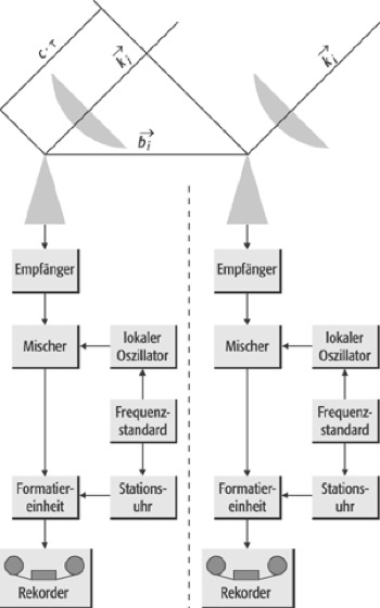 Die vom Empfänger verstärkten Analogsignale im Frequenzbereich von mehreren GHz werden mit einem Mischer auf eine Basisbandfrequenz von wenigen MHz heruntergemischt und in der Formatiereinheit digitalisiert. Die Bitströme werden dann zusammen mit hochgenauen Zeitzeichen von Stationsuhren auf Magnetbänder aufgezeichnet. Sowohl der Mischprozess als auch die Stationsuhren werden von Frequenzstandards gesteuert, die auch als Atomuhren bezeichnet werden. Die zeitliche Differenz der Ankunftszeiten der Signale an den beiden Stationen (Laufzeitunterschied) ist die primäre Beobachtungsgröße der geodätischen Radiointerferometrie. Zur Bestimmung der Laufzeitunterschiede werden die aufgezeichneten Datenströme mithilfe eines zentralen VLBI-Korrelators kreuzkorreliert (Abb.). Durch die Rotation der Erde werden bei der Korrelation kohärenter Signale Interferenzwellen erzeugt, die dem Verfahren ihren Namen gegeben haben. Durch Variation der zeitlichen Verzögerungen kann die maximale Amplitude der Interferenzwellen am Korrelator ermittelt und damit der Laufzeitunterschied bei der Aufnahme wiederhergestellt werden.