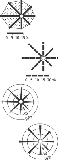 Richtungsdiagramm:Richtungsdiagramm: Beispiele für sternförmige Diagramme zur Darstellung der Windhäufigkeit.