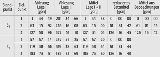 Die horizontale Winkelbestimmung in einem Standpunkt nach zwei Zielpunkten erfolgt durch Anzielen beider Punkte, z. B. mit dem Zielfernrohr eines Theodoliten, und Ablesung der Messwerte. Je nach Art und erforderlicher Genauigkeit kommen verschiedene Messverfahren zur Anwendung. Diese beruhen auf der mehrfachen Bestimmung eines oder mehrerer Winkel zur Vermeidung grober Fehler, zur Ausschaltung systematischer und Reduzierung zufälliger Messunsicherheiten. Bei den meisten Methoden der horizontalen Winkelbestimmung bildet ein Satz die Grundeinheit. Er besteht aus der Anzielung der Punkte im Uhrzeigersinn, zwischen denen die Winkel zu bestimmen sind. Diese Messungen gelten als Halbsatz. Anschließend schlägt man das Fernrohr durch und misst in Fernrohrlage II den zweiten Halbsatz, indem man die Zielpunkte, beginnend beim letzten im Gegenzeigersinn, der Reihe nach anvisiert und die Ablesungen registriert. Dies bezeichnet man als Messung eines Vollsatzes. Um sich vor Fehlern zu schützen und um die Genauigkeit zu steigern, werden häufig mehrere Vollsätze gemessen (Tab.). Dazu wird die Anfangsrichtung (Nullrichtung) systematisch über den Teilkreis verteilt. Dies geschieht durch Verstellen des Horizontalkreises zwischen den Sätzen um 200 gon/n wobei n die Satzanzahl bedeutet.