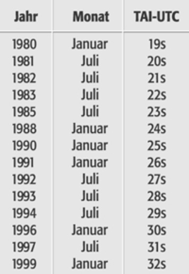 Schaltsekunde (Tab.):Schaltsekunde (Tab.): Übersicht der Entwicklung der Schaltsekunden während der letzten Jahre.