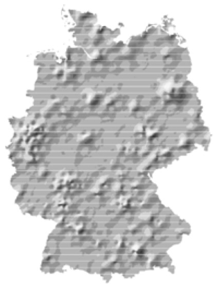 Schummerungskarte, E shaded map, im Unterschied zu Karten mit Reliefschummerung ein Kartentyp zur "plastischen" Darstellung thematischer Sachverhalte (vgl. thematische Oberfläche). Dabei werden auf der Grundlage des Prinzips der Objekt-Zeichen-Referenzierung ratio- oder intervallskalierten Daten mit Bezug zu einem unregelmäßigen oder regelmäßigen Punktnetz abgebildet. Die Repräsentation der Daten in der Schummerungskarte erfolgt durch Berechnung einer simuliert beleuchteten Oberfläche des Wertereliefs eines thematischen Attributs (3D-Analyse). Die Schummerungskarte ist im Sinne des kartographischen Zeichenmodells eine verlaufende flächenförmige Helldunkeldarstellung durch die Graphische Variable Helligkeit (Abb.).