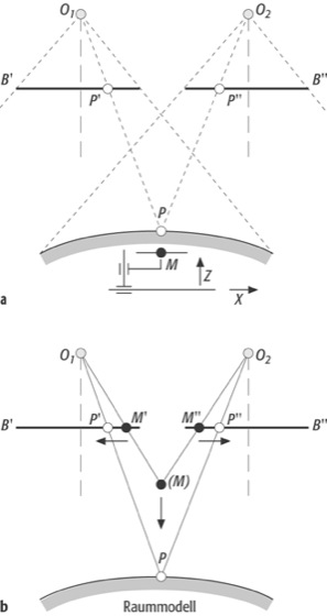 stereoskopisches Messen:stereoskopisches Messen: Prinzip der stereoskopischen Höhenmessung mit einer reellen (a) und einer virtuellen (b) Raummarke. O1, O2 Projektionszentren; B′, B″ Spuren der Teilbilder des Stereobildpaares; P = Modellpunkt; P′, P″ = homologe Bildpunkte; M′M″ = Teilmarken; M, (M) = reelle bzw. virtuelle Raummarke.