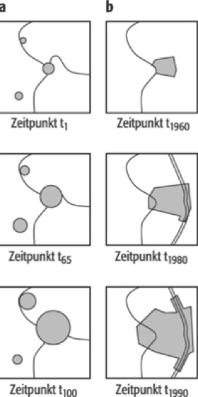 temporale Animation:temporale Animation: Beispiele temporaler Animation: a) Veränderung der Bevölkerungszahl, b) Ausdehnung eines Stadtgebiets.
