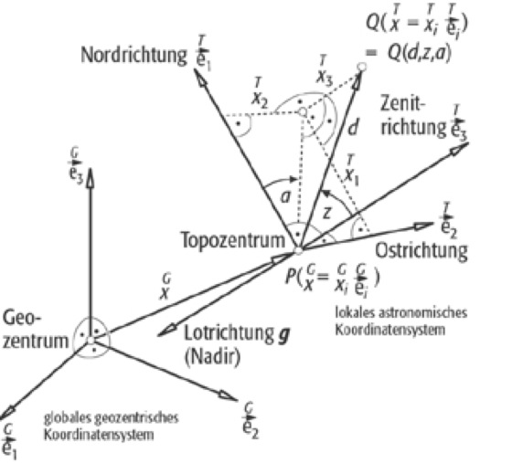 topozentrisches astronomisches Koordinatensystem:topozentrisches astronomisches Koordinatensystem: Topozentrisches astronomisches Koordinatensystem und lokale sphärische Polarkoordinaten.
