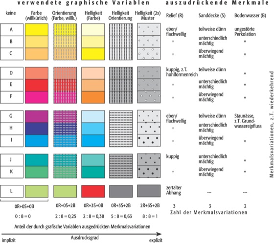 Anders wird bei der impliziten Darstellung das Begriffssystem in nur eine graphische Variable und eine Darstellungsschicht übertragen; so bei Wiedergabe des Inhalts aus obigem Beispiel als Orientierung eines Flächenmusters, das zur Füllung von Kreissignaturen benutzt wird. Zwischen diesen beiden Extremen sind Übergänge möglich. Schwierigkeiten und die Tendenz zur impliziten Darstellung ergeben sich, wenn die Zahl der darzustellenden Merkmale und Merkmalsausprägungen die Zahl der nutzbaren graphischen Variablen und/oder deren Variationsmöglichkeiten übersteigt. Dies kann besonders in einfarbigen Darstellungen auftreten, z. B. wenn zwölf Klassen durch eine Grauskala auszudrücken wären. Lässt sich diese nicht durch eine andere Helldunkelskala ersetzen, ist eine veränderte Klassifizierung des Merkmals nicht zu umgehen, z. B. die Bildung von fünf bis sieben Klassen, die u. U. frühere Klassen enthalten (implizieren). Ganz ähnlich können kontinuierliche Wertmaßstäbe als explizit aufgefasst werden, während man gestuften Wertmaßstäben Elemente der impliziten Darstellung zuschreiben kann. Die Transkriptionsform ist wesentlicher Bestandteil der Gestaltungskonzeption von Karten. Im Zusammenhang mit der quantitativen Beschreibung der Transkriptionsformen wird der Begriff Ausdrucksgrad verwendet (vgl. Abb. 2).