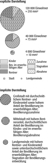 Eine explizite Darstellung liegt vor, wenn das gesamte Begriffssystem der Legende einschließlich der enthaltenen quantitativen Beziehungen in das graphische System übersetzt wird. Das ist z. B. der Fall in einer Darstellung der Entwicklung und der Altersstruktur der Bevölkerung durch Kreissektorendiagramme variabler Größe mit folgender Zuordnung der graphischen Variablen: Einwohnerzahl - Größe der Diagrammfläche, Altersklasse - Helligkeit, Entwicklungstendenz - Muster, Stadt-/Landgemeinde - Form (Abb. 1). Explizite Darstellungen sind i. d. R. mehrschichtig (Darstellungsschicht).