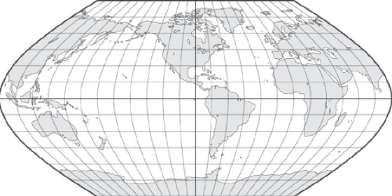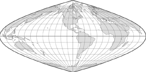 unechte Zylinderentwürfe, E pseudocylindric projections, dienen der Abbildung der ganzen Erde. Sie werden oft als Grundlage für Planisphären verwendet. Unechte Zylinderentwürfe vermeiden die mangelnde Formähnlichkeit der echten Zylinderentwürfe. Als normale Abbildungen besitzen die unechten Zylinderentwürfe in der Karte einen geradlinigen Äquator und geradlinige Parallelkreise. Das gleiche gilt für den Mittelmeridian. Die Bilder der Meridiane sind Kurven. Bei Mollweides unechtem Zylinderentwurf sind es Ellipsen. Der Mercator-Sanson-Entwurf hat Sinuslinien als Meridianbilder (Abb. 1); desgleichen Goodes Entwurf. Die meisten unechten Zylinderentwürfe sind flächentreu. Daraus ergeben sich die Form der Meridiane und der Abstand der Parallelkreisbilder voneinander. Ein von O.  Winkel (1874-1953) angegebener Entwurf hat gleichabständige Parallelenbilder. Damit geht jedoch die Flächentreue verloren. (Abb. 2).