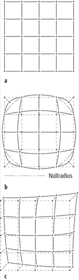 Verzeichnung:Verzeichnung: a) fehlerfreie Abbildung, b) symmetrische radiale Verzeichnung, c) asymmetrische Verzeichnung eines Objektivs.