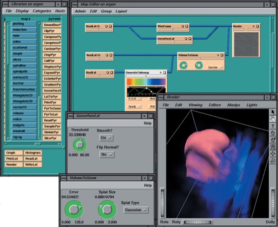 Visualisierungssysteme, E visualization systems, sind Softwaresysteme, die eine Vielzahl von Modulen zur Realisierung von Visualisierungsprozessen bereitstellen. Damit setzen sie das Visualisierungsszenarium des interaktiven Postprocessing um, bei dem die Datenerzeugung vom Visualisierungsprozess entkoppelt ist. Für den Datenaustausch stellen diese Systeme allgemein verwendbare Datenformate bereit, wie z. B. das neutrale Datenformat NetCDF. Heutige Visualisierungssysteme sind datenflussorientiert, wobei sich die einzelnen Module graphisch konfigurieren lassen. Sie integrieren verschiedene Werkzeuge für spezielle Aufgaben und sind um beliebige Module erweiterbar. Man unterscheidet allgemeine und "special-purpose-Systeme" je nachdem, ob die Module einer speziellen Aufgabenstellung angepasst wurden oder nicht. Allgemeine Systeme stellen eine große Vielfalt von Modulen für sämtliche Stufen der Visualisierungspipeline bereit. Wichtige Vertreter dieser Gruppe sind z. B. AVS, OpenDX oder IRIS-Explorer ( Abb.).