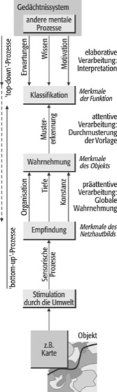 Sämtliche kognitionspsychologischen Ansätze gehen davon aus, dass sich die Wahrnehmung und kognitive Verarbeitung optisch dargebotener Informationen als Prozess beschreiben lässt, der über mehrere Ebenen verläuft: Vom ersten Blick auf eine Karte über das Verständnis des Gesehenen bis zur Einprägung im Gedächtnis. Obwohl es eine sachlogische Abfolge von der Wahrnehmung bis zum Verstehen gibt, laufen die Prozesse auf den Ebenen parallel und interaktiv ab.