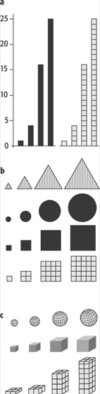 Wertmaßstab:Wertmaßstab: Größenverhältnisse verschiedener Figuren. Die vier Figuren jeder Gruppe verhalten sich wie 1:4:16:25; a) lineare Figur (eindimensional), b) flächenhafte Figuren (zweidimensional), c) räumliche Figuren (dreidimensional).