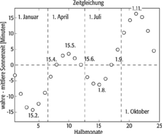 Zeitgleichung, wahre minus mittlere Sonnenzeit, resultiert aus der leicht elliptischen Umlaufbahn der Erde um die Sonne. Variiert zwischen +17 Minuten (Anfang November) und -14 Minuten (Anfang Februar). Sie ist bei astronomischen Ortsbestimmungen zu berücksichtigen (Abb.).