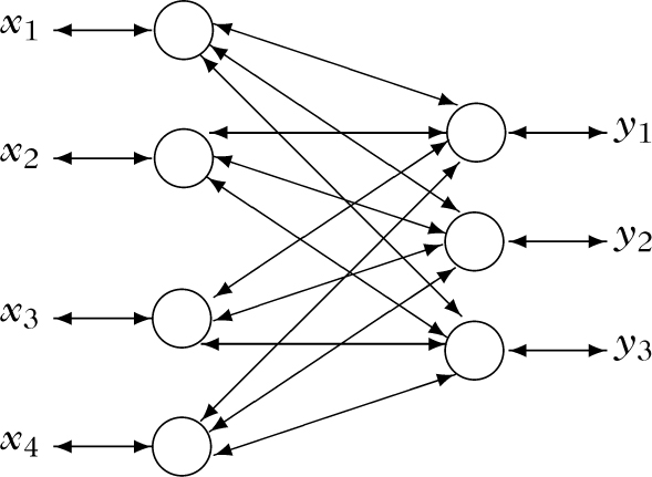 arbeiten und Ridge-Typ-Aktivierung mit Schwellwert Θ := 0 verwenden (zur Erklärung dieser Begriffe siehe formales Neuron).Die folgende Abbildung dient zur Illustration; zu Ihrer Erläuterung sei ferner erwähnt, daß alle parallel verlaufenden und entgegengesetzt orientierten Vektoren sowie die Ein- und Ausgangsvektoren jedes Neurons wie üblich zu einem bidirektionalen Vektor verschmolzen wurden, um die Skizze übersichtlicher zu gestalten und die Bidirektionalität auch optisch zum Ausdruck zu bringen.