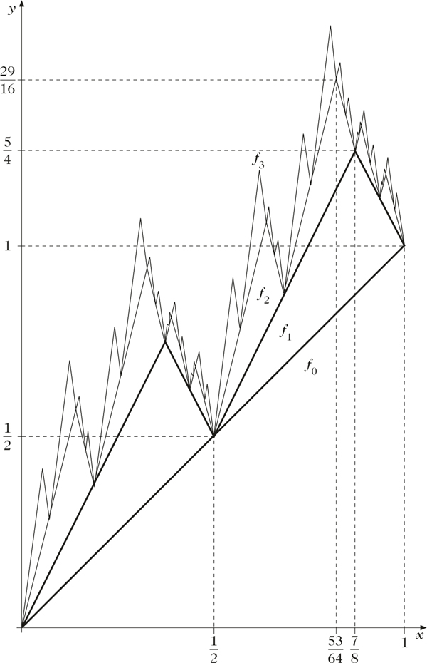 Es sei \({f}_{0}(x)=x\) für \(x\in [0,1]\). Dann bekommt man fn aus fn−1, indem man jeden linearen Abschnitt von fn−1 halbiert und jede der Hälften durch zwei lineare Stücke mit doppelter Steigung, also jede „Zacke” von fn−1 durch vier kleinere, doppelt so steile Zacken ersetzt. Man vergleiche hierzu die Abbildung.