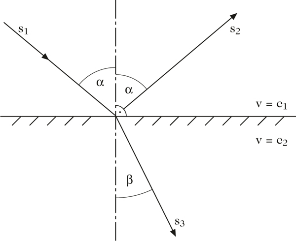Der von links einfallende Strahl S1 teilt sich auf in den reflektierten Strahl S2 und den gebrochenen Strahl S3. Die Ausbreitungsgeschwindigkeit im oberen Medium sei C1, im unteren C2.