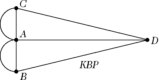 Man erkennt deutlich, wie Euler hier implizit die Ecken A, B, C, D und die Kanten AB, … eines Graphen, ja sogar Multigraphen, eingeführt hat. Graphentheoretisch formuliert fragt das Königsberger Brückenproblem danach, ob in dem unten skizzierten Multigraphen KBP ein sogenannter Eulerscher Kantenzug existiert. Als Folgerung aus Eulers Untersuchungen ergibt sich schließlich, daß das Königsberger Brückenproblem keine gewünschte Lösung besitzt.