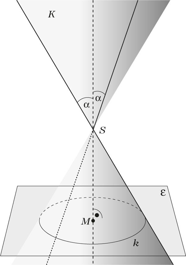 Menge aller Punkte des Raumes, die auf den Geraden liegen, die einen Punkt S des Raumes mit den Punkten eines Kreises k verbinden (wobei S nicht in der Ebene ϵ des Kreises liegen darf). Wenn man in der Mathematik von einem Kegel spricht, so ist damit meist ein Doppelkegel gemeint; so wird z. B. bei der Untersuchung der Kegelschnitte stets die Schnittkurve zwischen einer Ebene und einem Doppelkegel betrachtet. Der Punkt S heißt Spitze, die Gerade durch S und den Mittelpunkt M des Kreises k Achse des Kegels K. Die Geraden durch die Spitze und beliebige Punkte des Kreises k werden als Mantellinien, der Winkel α zwischen der Achse und den Mantellinien als der halbe Öffnungswinkel von K bezeichnet.