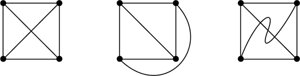 Von den drei dargestellten Einbettungen des Graphen K4 in die Ebene ℝ2 ist die linke normal, die mittlere kreuzungsfrei und die rechte weder normal noch kreuzungsfrei.