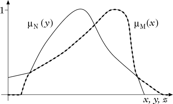 Erweitertes Maximum zweier Fuzzy-Zahlen; es ist \({\mu }_{{\max }}(z)=\mathop{\sup }\limits_{(x,y)}\min ({\mu }_{M}(x),{\mu }_{N}(y))\) mit z = max(x, y)