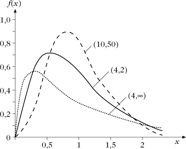 Dichtefunktion der F-Verteilung für die Freiheitsgrade (n1, n2) = (4, ∞), (4, 2), (10, 50)