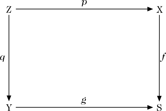 Begriff im Kontext der Kategorien. Ist in einer Kategorie \(\mathcal{C}\) ein kommutatives Diagramm von Morphismen gegeben wie in Abbildung 1 dargestellt, so heißt das Diagramm kartesisches Diagramm, und (Z, p, q) heißt Faserprodukt von X, Y über S, wenn es für jedes kommutative Diagramm von Morphismen in \(\mathcal{C}\) wie in Abbildung 2 dargestellt genau einen Morphismus \({Z}^{\prime}\mathop{\to }\limits^{h}Z\) gigt mit