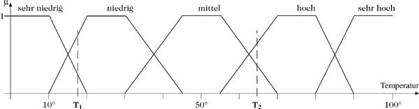 Betrachten wir die linguistische Variable „Temperatur“ mit den Ausprägungen sehr niedrig, niedrig, mittel, hoch, sehr hoch, die in der nachfolgenden Abbildung beschrieben werden. Die Temperaturen<?PageNum _214T1 und T2 lassen sich dann fuzzifizieren zu