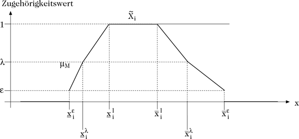 Fuzzy-Intervalle vom ε-λ-Typ \begin{equation} \tilde{A}=(\underline{a}^{\varepsilon};\underline{a}^{\lambda};\underline{a}^{1};\bar{a}^{1};\bar{a}^{\lambda};\bar{a}^{\varepsilon})^{\varepsilon,\lambda} \end{equation} haben stückweise lineare Zugehörigkeitsfunktionen und sind für praktische Anwendungen besonders gut geeignet. Sie entsprechen dem Darstellungssatz für unscharfe Mengen, beschränken aber vereinfachend die α-Niveau-Mengen auf drei prominente Niveaus ϵ, λ und 1 mit \begin{eqnarray}0\lt \varepsilon \lt \lambda \lt 1.\end{eqnarray}.