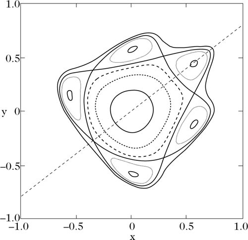 Bis auf das quadratische Glied handelt es sich um eine Rotation um den Winkel −α in der (x, y)- Ebene. Die Hénon-Abbildung ist flächentreu, durch ihre iterierte Abbildung wird ein bekanntes Beispiel von Chaos gegeben, in dem ein seltsamer Attraktor, der Hénon-Attraktor, auftritt.