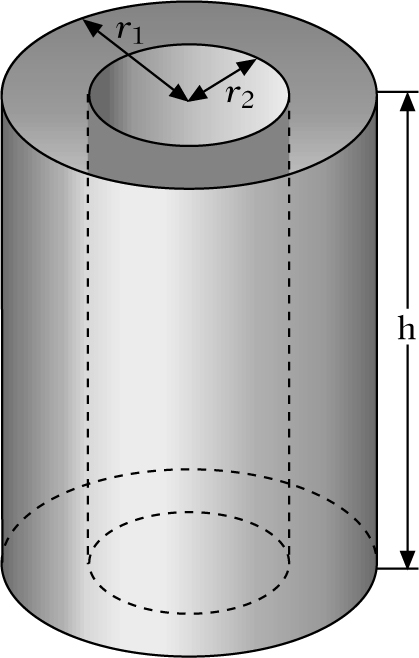 Das Volumen eines Hohlzylinders mit dem Außenradius r1, dem Innenradius r2 und der Höhe h beträgt