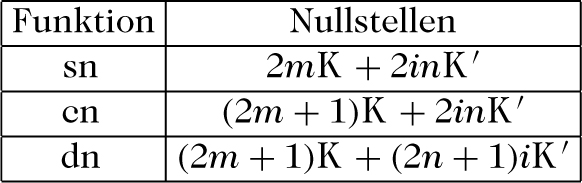 Perioden, Nullstellen und Pole der Jacobischen elliptischen Funktionen findet man gemäß der Definition durch das Argand-Diagramm. Hier eine Zusammenfassung der Perioden in Tabellenform: