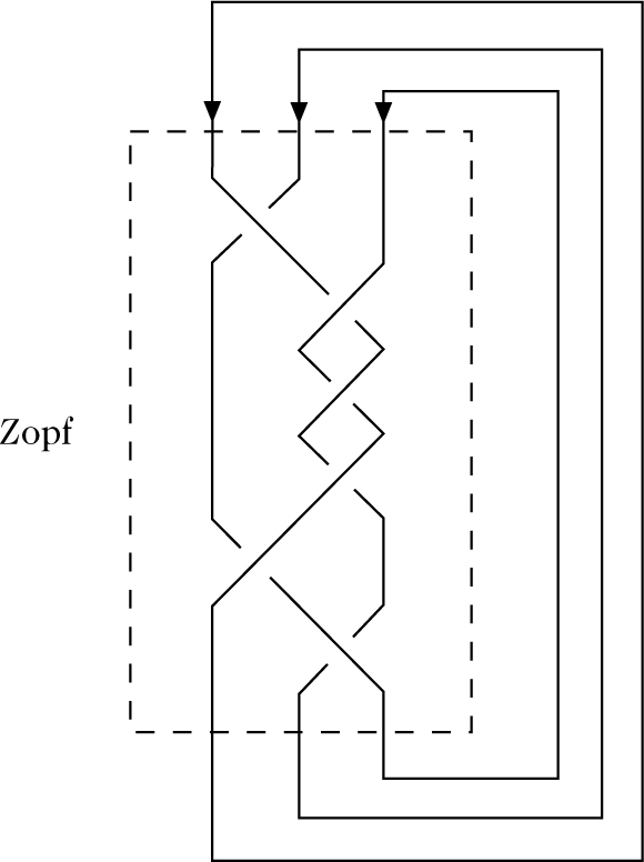 Es wird nicht gefordert, daß der oben vom k-ten Punkt ausgehende Strang unten im k-ten Punkt endet. Mit einer Äquivalenzrelation ähnlich wie bei Knoten und einer Verknüpfung von Zöpfen, die im Untereinandersetzen besteht, bilden die Zopfklassen mit n Strängen die Zopfgruppe \(\begin{eqnarray}{ {\mathcal B} }_{n}\end{eqnarray}\). Sie wurde von E. Artin eingeführt und durch Erzeugende σ1,…,σn−1 und Relationen σiσk = σkσi (für |i − k| > 1) sowie σiσi+1σi = σi+1σiσi+1 (für i = 1,…,n − 2) beschrieben. Die zuletzt genannten Relationen entsprechen Reidemeisterbewegungen vom Typ Ω3. \(\begin{eqnarray}{ {\mathcal B} }_{n}\end{eqnarray}\) läßt sich auch als Fundamentalgruppe eines bestimmten Konfigurationsraumes darstellen und tritt als Untergruppe der Automorphismengruppe der ( freien) Fundamentalgruppe des Komplements von n Punkten in der Ebene auf. Damit werden Zöpfe klassifiziert, und die Zopfgruppe erweist sich als torsionsfrei. Einen Zusammenhang zur Knotentheorie stellt man her, indem man die Endpunkte eines Zopfes außen herum durch in einer Ebene liegende Kurven mit den Anfangspunkten zum Zopfknoten bzw. zur Zopfverkettung verbindet, wobei eine Orientierung mitgeliefert wird (Abb. 4). Nach J.W. Alexander kann jeder Knoten und jede Verkettung auf diese Weise durch einen Zopf mit einer geeigneten Anzahl von Strängen realisiert werden. Ein wichtiger Satz von A.Markow gibt an, unter welchen Bedingungen zwei Zöpfe mit möglicherweise verschiedenen Anzahlen von Strängen zu äquivalenten Knoten oder Verkettungen führen. Die Minimalzahl der bei der Konstruktion benötigten Stränge ist der Zopfindex, eine Knoteninvariante. Man kann zeigen, daß diese gleich der Minimalzahl der Seifertkreise ist, die bei Seiferts Konstruktion einer eingespannten Fläche auftreten.
