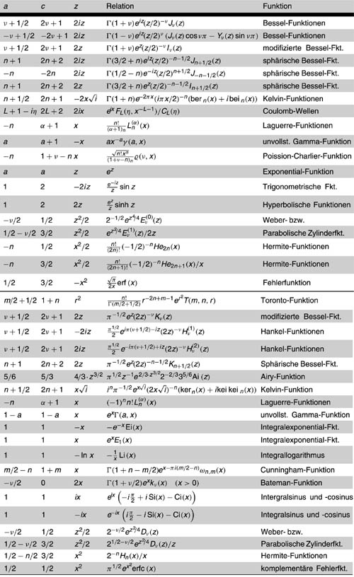Einige Relationen der Kummer-Funktionen zu anderen speziellen Funktionen zeigt die Tabelle.