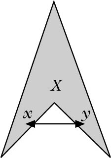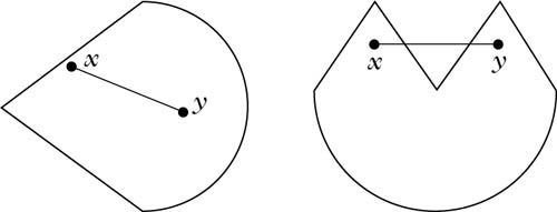 gilt, wobei (x, y) = [x, y] \{x, y} sei. Jede streng konvexe Menge ist offenbar konvex, aber nicht umgekehrt. Jede konvexe Menge ist offensichtlich sternförmig, jedoch nicht umgekehrt.