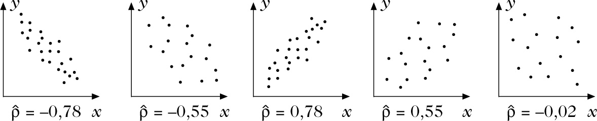 Man spricht von positiver Korrelation, wenn \(\hat{\varrho }\gt 0\), und von negativer Korrelation, wenn \(\hat{\varrho }\lt 0\). Da die einfache Korrelation den Grad der linearen Abhängigkeit zwischen den Zufallsgrößen widerspiegelt, gibt es einen typischen Zusammenhang zwischen der Gestalt der Stichprobenwerte als Punktwolke im kartesischen Koordinatensystem und dem Korrelationskoeffizienten \(\hat{\varrho }\), siehe Abbildung.